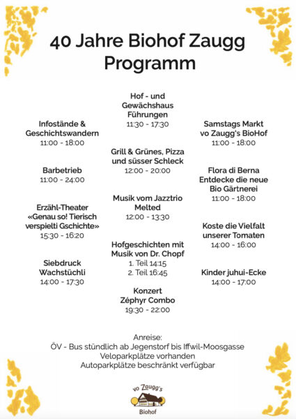 Unser Verpächter der Biohof Zaugg feiert sein 40-jähriges mit einem grossen Fest. Wir freuen uns, zu diesem Anlass unsere Bio-Wildpflanzengärtnerei vorzustellen.