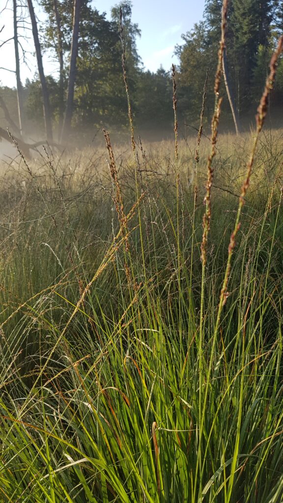 Das Blaue Pfeifengras  (Molinia caerulea) wächst in der Natur in wechselfeuchten Moorwiesen und Flachmooren.  Mit bis zu einem Meter Höhe wächst es  niedriger als das sonst in allen Teilen sehr ähnliche Riesen-Pfeifengras (Molinia arundinacea) , welches 2m hoch wird und in wechselfeuchten Wiesen und an Berghängen mit tonigem Untergrund zuhause ist.  Da die Stängel der Pfeifengräser keine knickanfälligen Nodien besitzen, wurden sie früher zum Reinigen von Pfeifen verwendet. Das Blaue Pfeifengras bildet einen ca. 40cm hohen Horst, darüber erheben sich schlanke Halme mit blau-braunen Blütenrispen. Das blau-grüne Laub ist eine wichtige Nahrungsquelle für verschiedene Schmetterlingsraupen, zusammen mit den Stängeln und Samenständen verfärbt es sich im Verlauf des Sommers in ein goldenes Gelb.